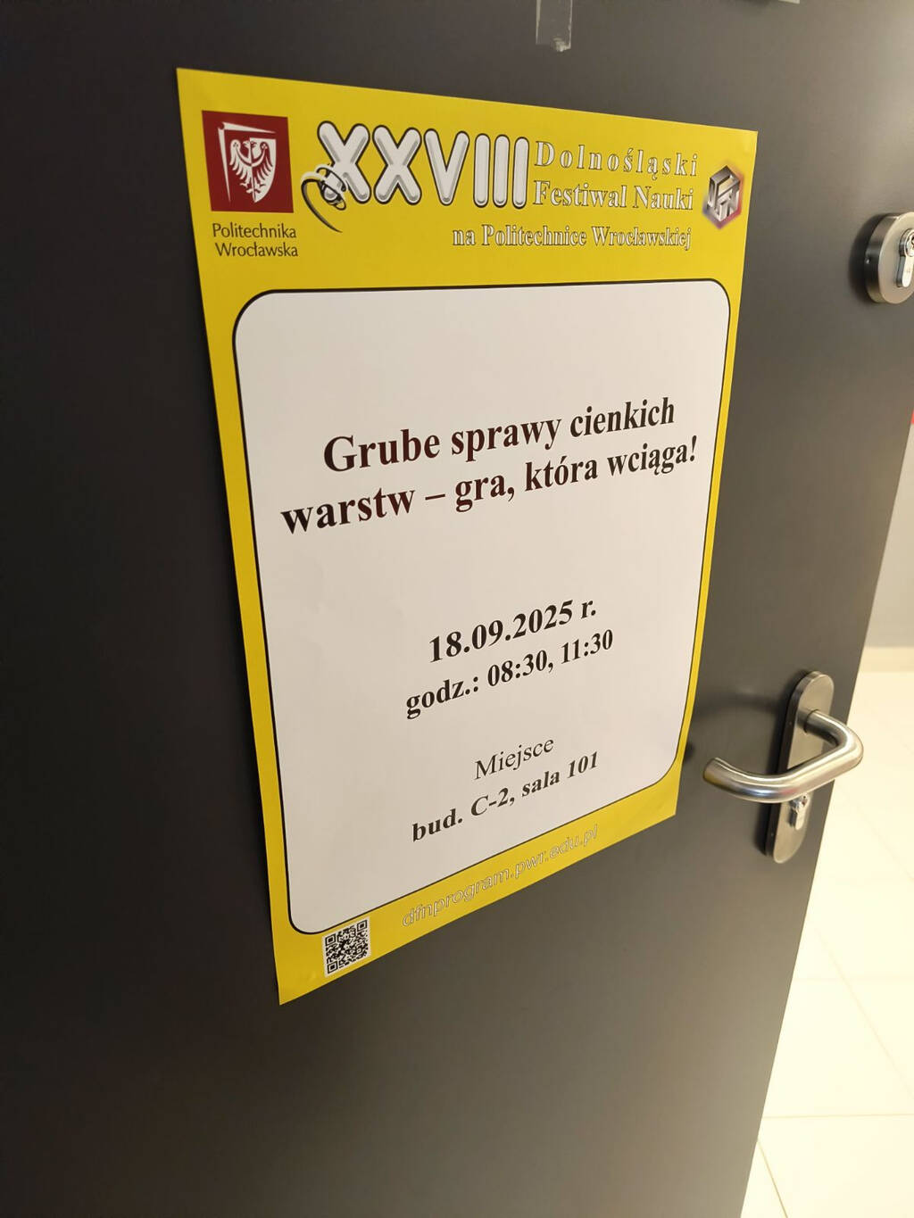 W ramach Dolnośląskiego Festiwalu Nauki 2025 przygotowaliśmy grę edukacyjną „Grube sprawy cienkich warstw”, która pozwoliła w praktyczny sposób odkrywać tajemnice nanotechnologii. Warsztaty pokazały, że nauka może być zrozumiała i angażująca już od najmłodszych lat, a kontakt z nią rozwija ciekawość i wyobraźnię.
